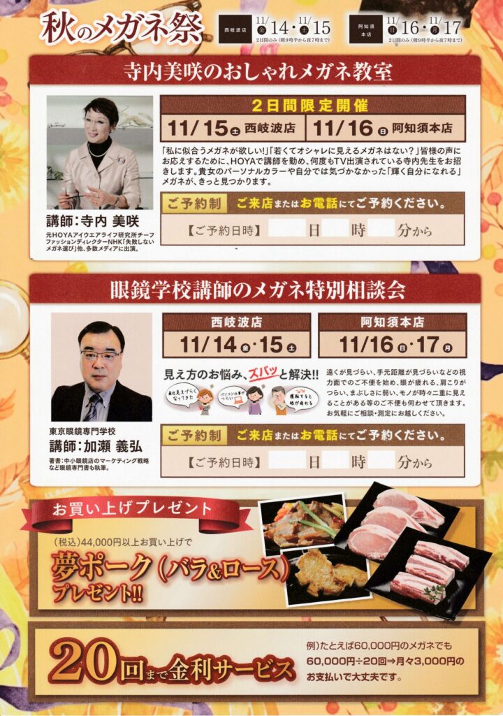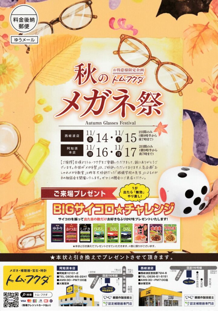 11月14日と15日はトム・フクダ西岐波店にて、16日と17日は阿知須本店でメガネ祭りを開催します。