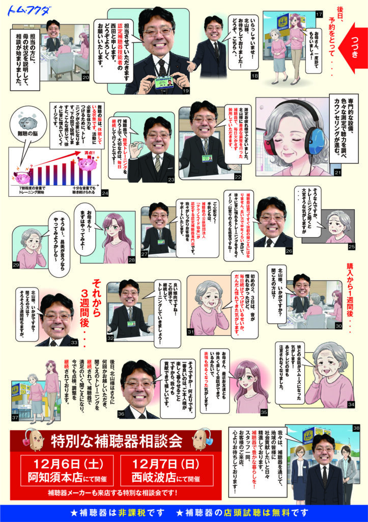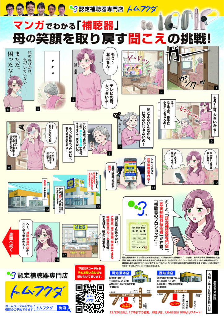 補聴器 補聴器相談会のお知らせ 2025.11.29 認定補聴器専門店のトム・フクダの今年最後の補聴器相談会のお知らせです。 ご本人や、ご家族の聴こえの悩みなど認定補聴器技能者が承ります。 阿知須本店は12月6日、西岐波店は12月7日にメーカー担当者とトム・フクダの認定補聴器技能者6名が補聴器の相談、点検、掃除をさせていただきます。 ぜひこの機会にご来店され、よりよい聴こえで年末・年始をお過ごしください。 いつも応援ありがとうございます! ↓↓↓ ぽちっとお願いします!! にほんブログ村 投稿者: tom-fukuda補聴器宇部, 山口, 補聴器, 認定補聴器専門店, 認定補聴器技能者コメント: 0 別府地獄めぐり