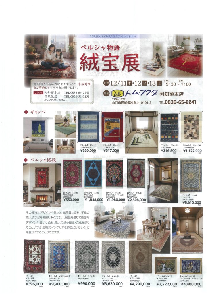 来る12月11日から13日の3日間、第18回目のペルシャ絨毯展示会をトム・フクダ阿知須本店で行います。