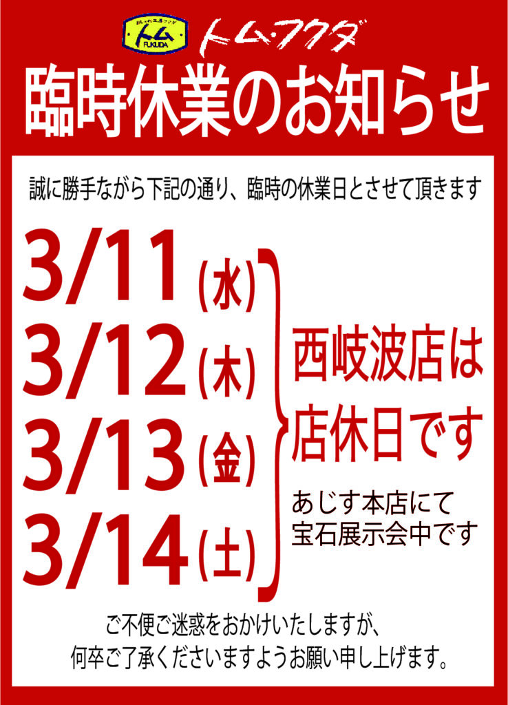 トム・フクダ西岐波店は、3月11日から14日の4日間、阿知須本店で開催される「創業祭」に伴い、