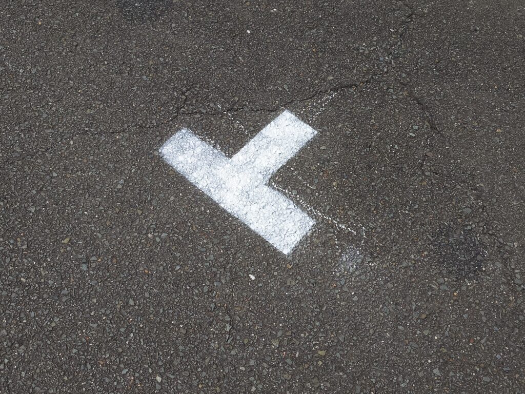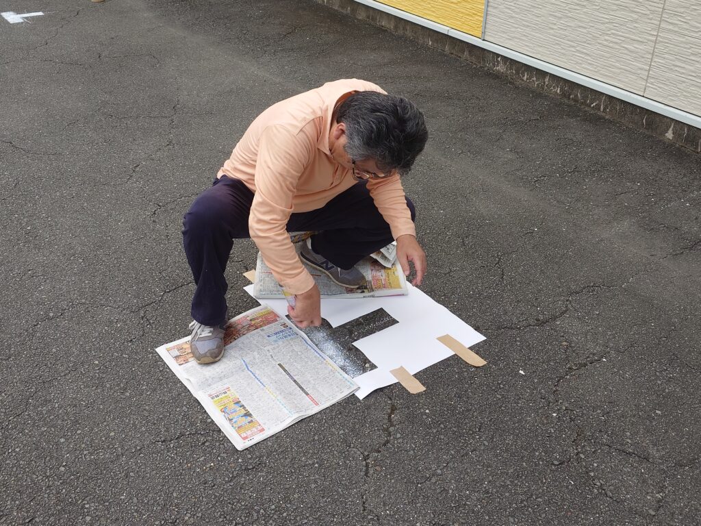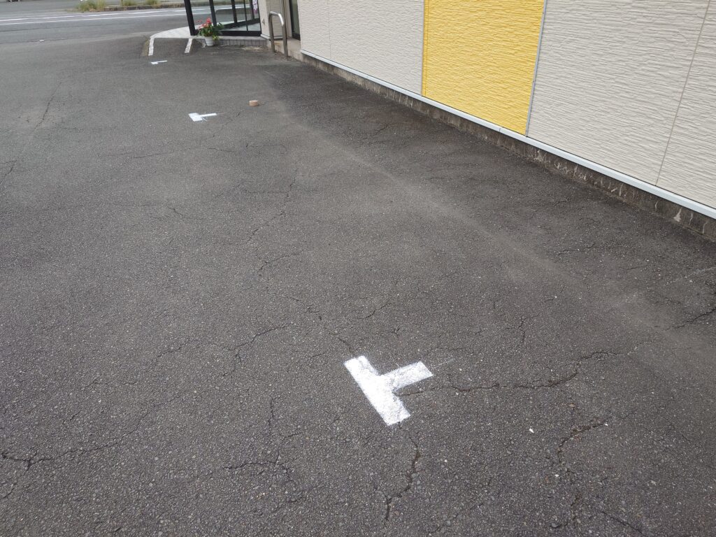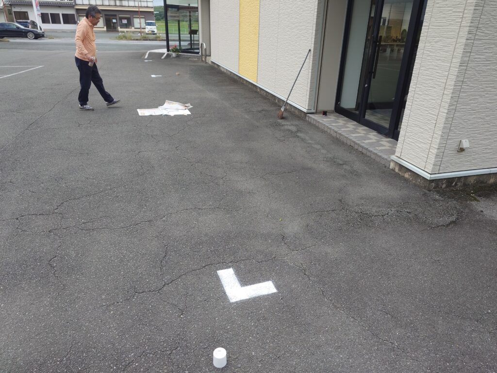 トム・フクダ阿知須本店には、常時駐車場は14台分あるのですが、毎回展示会の時には、停めきれなくなるので、毎回臨時で3台分油性のチョークでラインを引いていました。チョークは、設営の時に雨が降ると引けないし、すぐに消えてしまうので、来る22日からの「とっておきの会」にむけて、ラインを引きました。